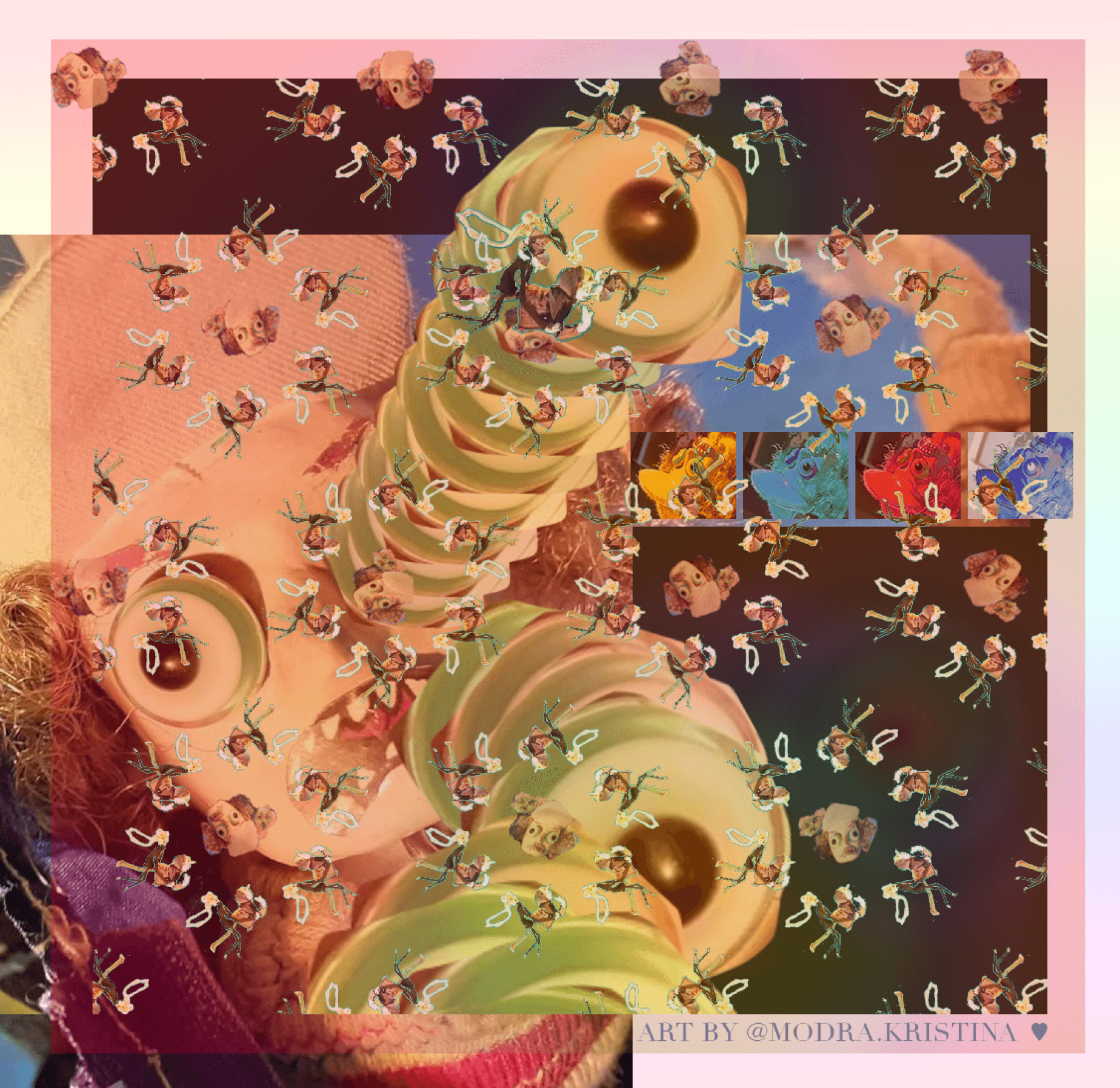 Nejradši jsem pracovala na něčem hmotném – třeba tady na šnuptychl panenkách, který jsem občas přilepila k nějakým klauzurám, ale v podstatě šlo o volnou tvorbu.