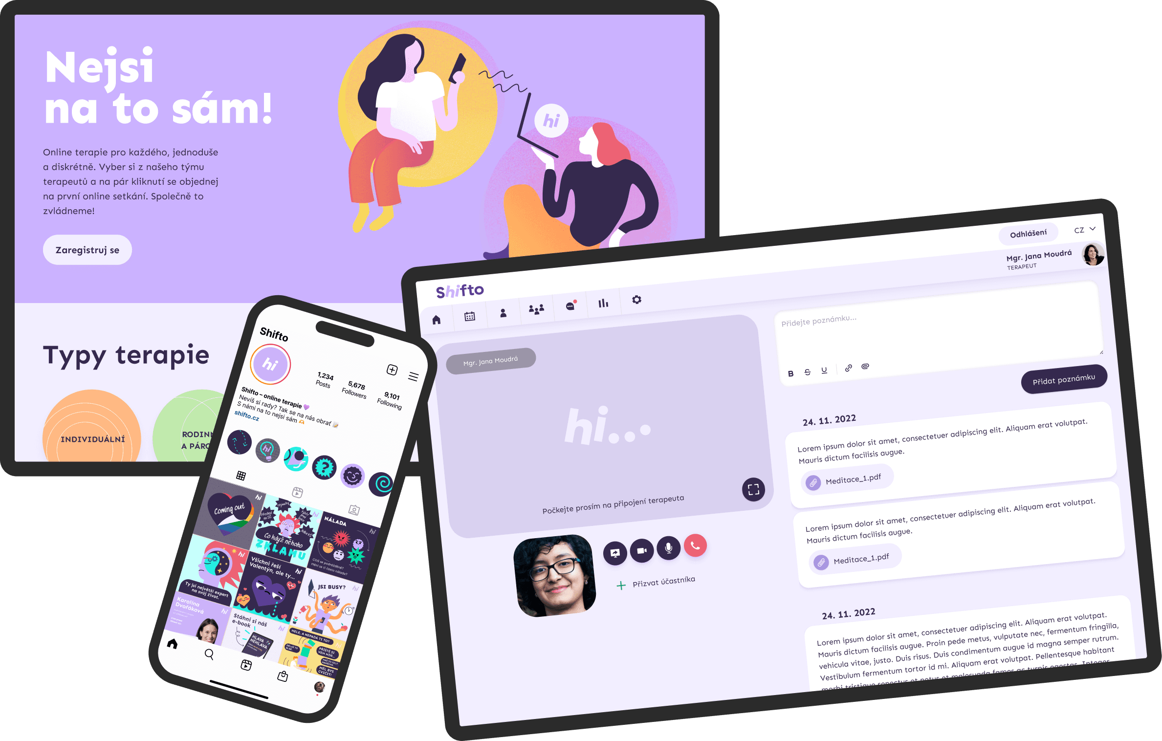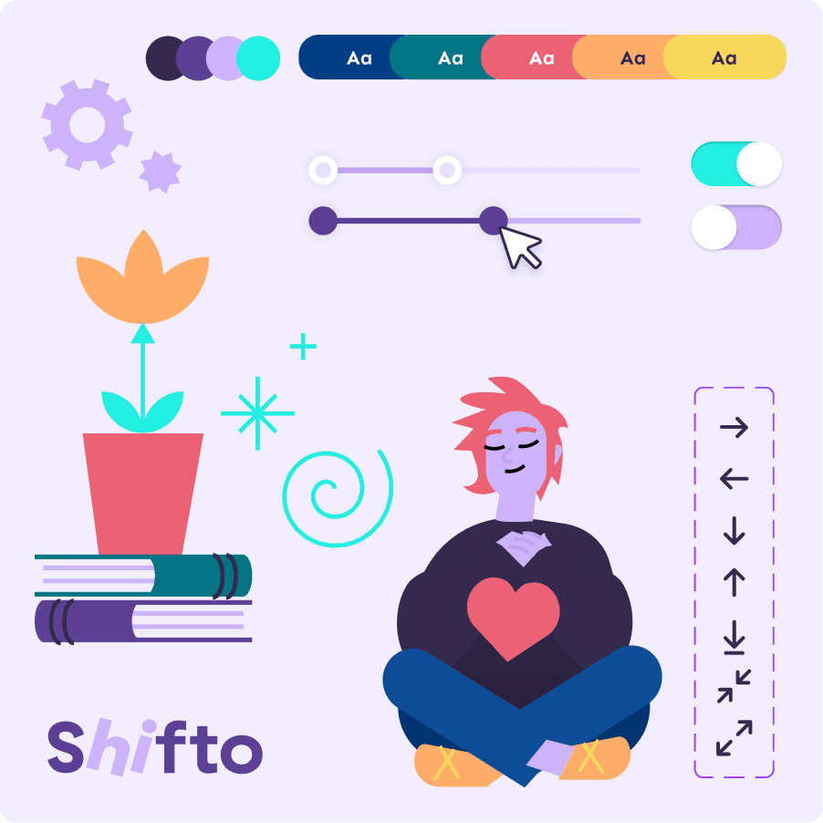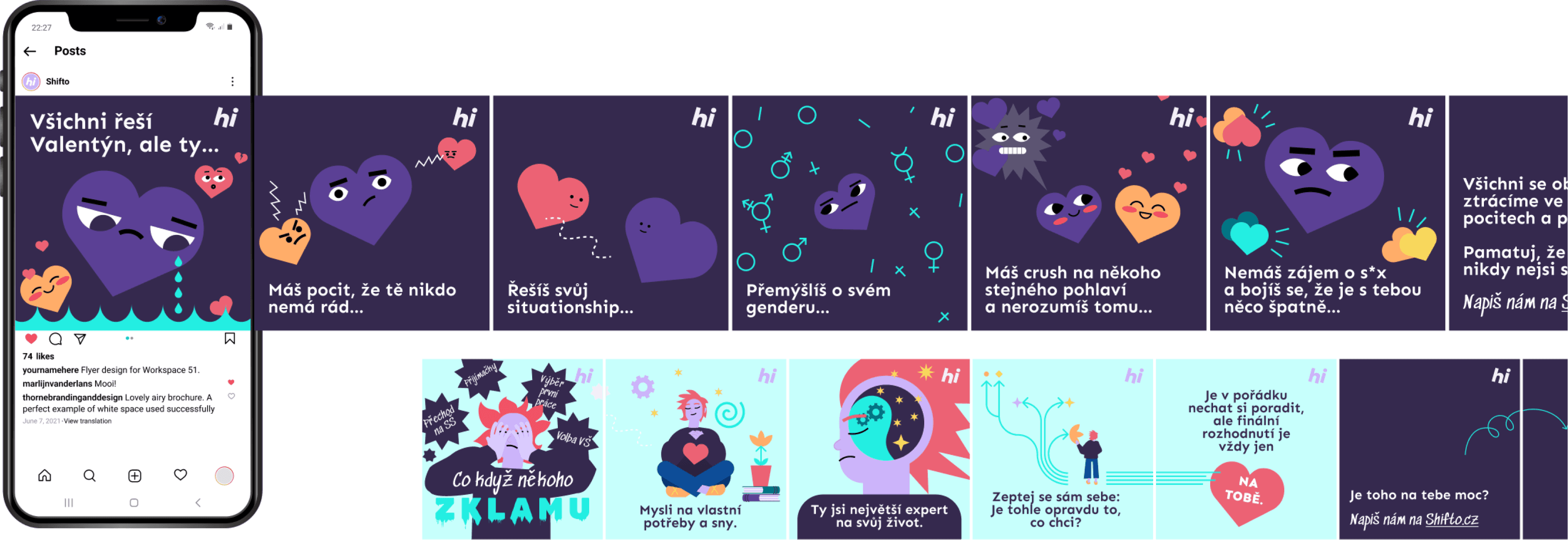 Navrhla jsem, že bych chtěla Shifto komunikovat skrz ilustrace. Hlavní pointa tkvěla ve ztotožnitelnosti stylizovaných postav, emocí a také odlišení a jedinečnost značky. Shifto mělo v plánu dělat osvětu o duševním zdraví pro teenagery, tak dávalo smysl vyvinout vizuální jazyk, co dokáže zaujmout, je příjemný na pohled a dokáže komunikovat citlivá témata ne-cringe způsobem.