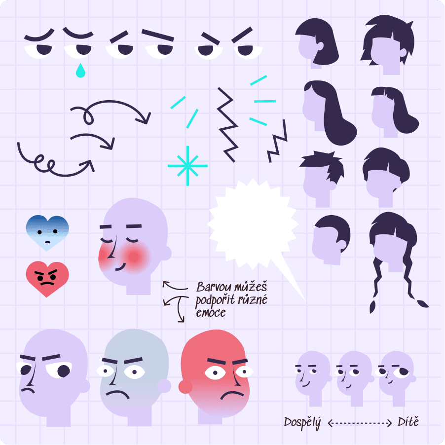 Protože jsem byla v týmu jediná ilustrátorka a bylo třeba vyrábět mnoho materiálů, vytvořila jsem příručku, pomocí které šlo ilustrace skládat jako stavebnici.