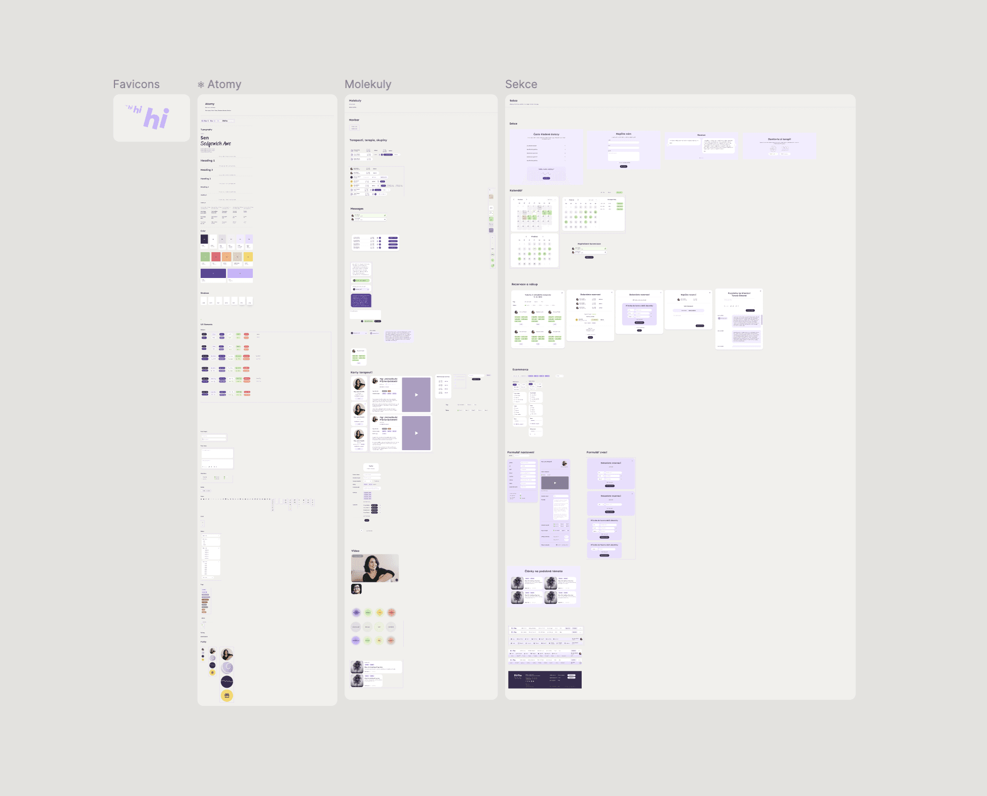 Atomic design je metoda pro tvorbu design systémů, která rozděluje uživatelské rozhraní (UI) do pět hierarchických úrovní inspirovaných chemií: atomy, molekuly, organismy, šablony a stránky. Tímto způsobem umožňuje vytvářet konzistentní, škálovatelné a snadno udržovatelné designy tím, že se začíná od nejmenších, opakovaně použitelných prvků a postupně se skládají komplexnější celky. Já jsem si to v tomto projektu trochu zjednodušila a organismy i šablony spojila do jedné kategorie.